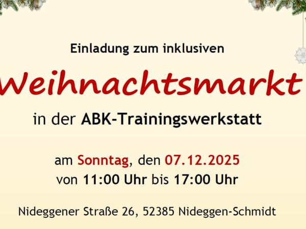 Wie jedes Jahr lädt das ABK-Hilfswerk herzlich ein zum ABK-Weihnachtsmarkt in unserer Trainingswerkstatt in Nideggen-Schmidt, Nideggener Str. 26.